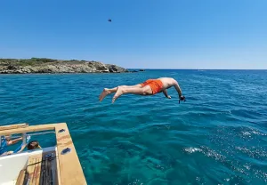 The cruise includes multiple swim stops at Panteronisia, Epitafios, and Livadi, in Despotiko Island, which is rich in 4,000 years of history. There, you’ll enjoy a delicious beach BBQ in a truly unique setting. Departure is at 09:30 from Antiparos port, with return around 17:00.